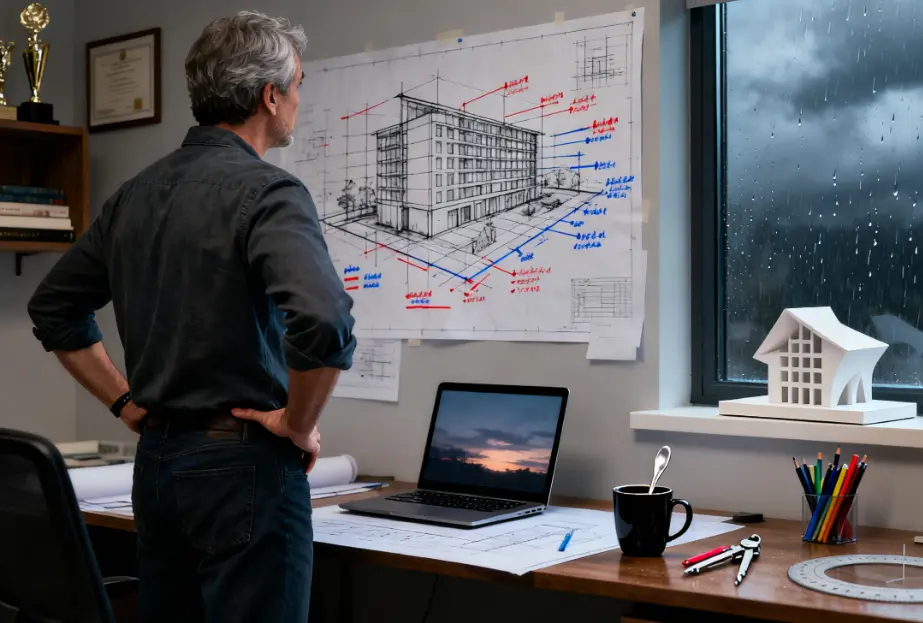 豆包生成缩略图指令: “生成一张建筑设计院办公室场景的图片,展现设计师在电脑前工作的场景,桌面上有图纸、咖啡杯和电脑,背景是书架和建筑模型,整体氛围要体现设计行业的专业性与工作压力,采用写实风格,色调偏冷”