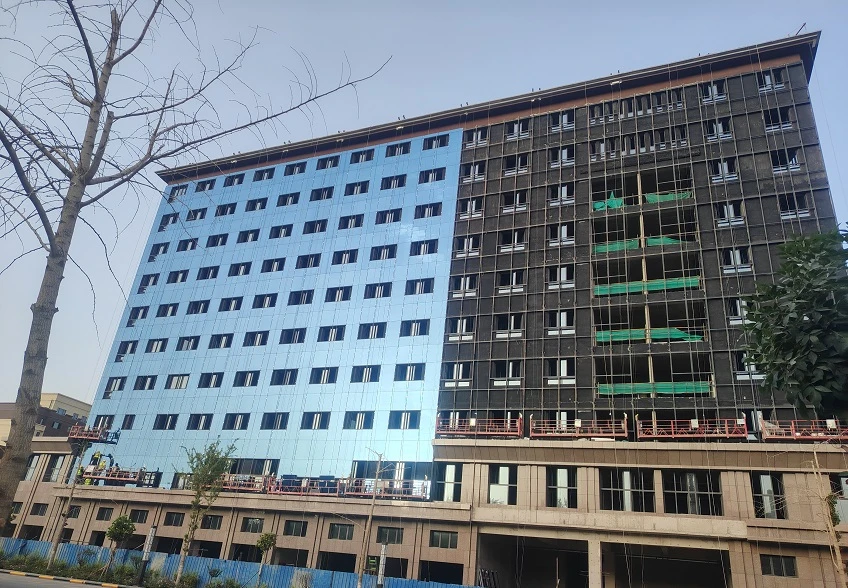 1. 高性能材料应用:幕墙主体采用双层中空Low-E玻璃,有效阻隔且末强烈的日照紫外线,同时具备优异的隔热保温性能,大幅降低酒店运营能耗。搭配定制的高强度铝型材框架,确保了整体结构的稳定与轻盈。