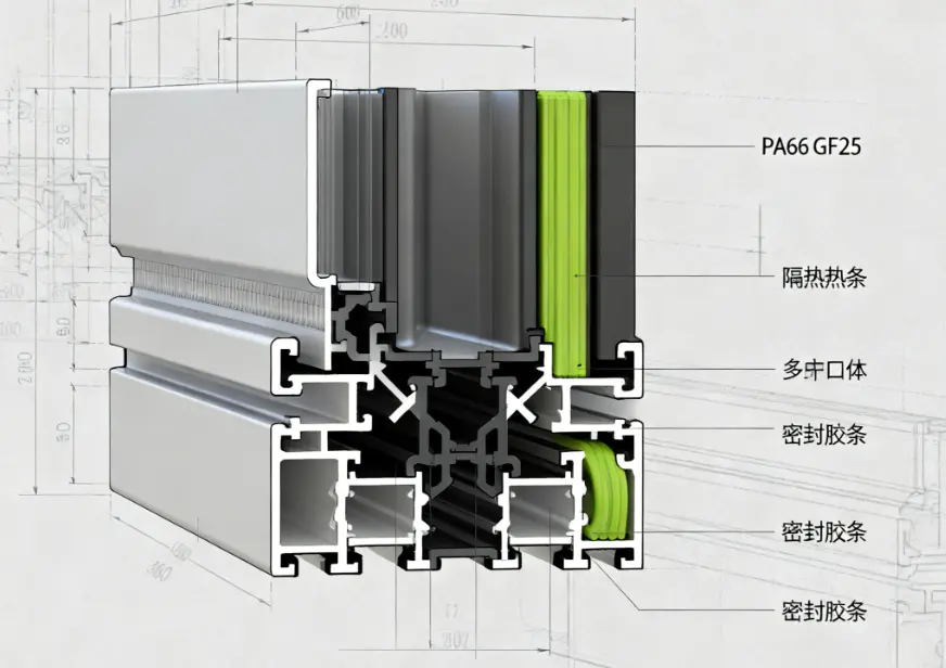 住宅门窗推荐采用穿条式PA66 GF25型材,兼顾性能与可靠性。