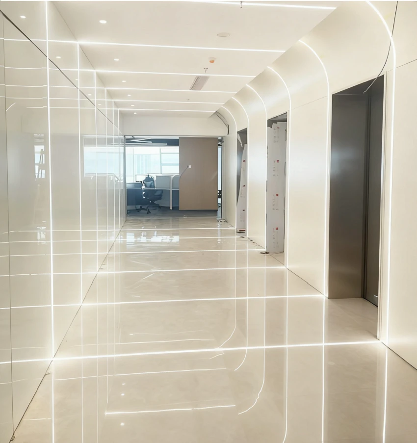 - 拉丝不锈钢装饰条:精确勾勒天棚与墙面线条,强化空间整体性与现代感