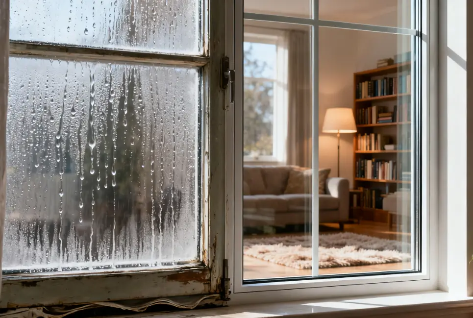 保温门窗与普通旧窗在冬季的对比,展现其杜绝结露、保持室内干爽温暖的效果。